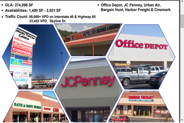Tenants include JC Penney, Harbor Freight, Cimamart movie, Office Depot, Medical care etc.