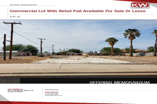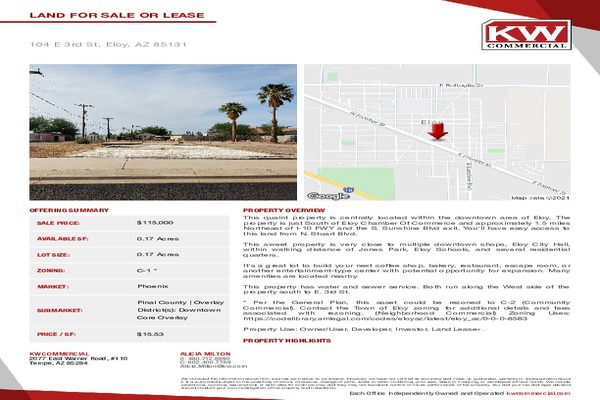 This quaint property is centrally located within the downtown area of Eloy. The property is just South of Eloy Chamber Of Commerce and approximately 1.5 miles Northeast of I-10 FWY and the S. Sunshine Blvd exit. You'll have easy access to this land from N. Stuart Blvd.